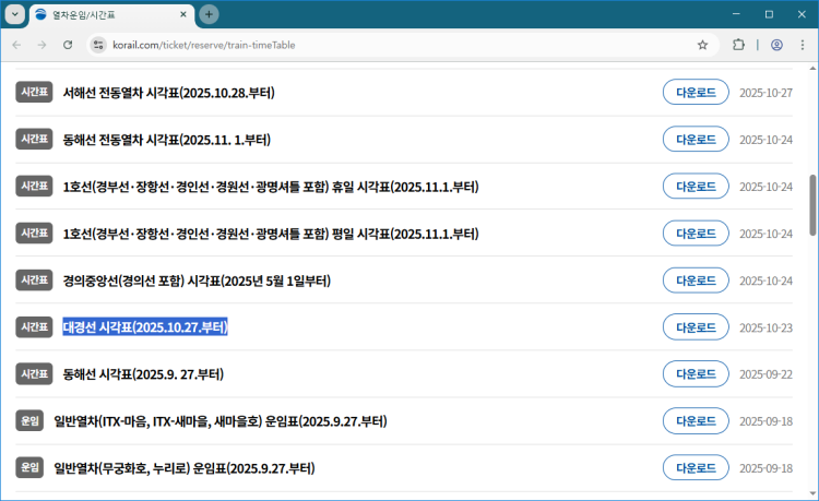 레츠코레일 홈페이지에서 갱신되는 시간표를 볼 수 있습니다