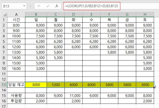 안녕하십니까. 엑셀 함수에 대해 문의드립니다.표에서 처럼 일일 생산량을 계산할려고합니다. 예) 일요일에 경우 매 시간 사용량이 있어 =(8시 사용량-16시 사용량)+투입량= A값을 구할 수 있는데 화요일~금요일까지는 16시에 값이 없어 매번 수식을 변경해야합니다.그래서 각 열 중 8시~16시 까지 마지막 값이 당일재고 요일 셀에 나타나게 할수 있는 함수가 있나요?그럴경우 월요일 은 5,300값이 표기 되도록 할수 있을 까요?고수분들의 답변 부탁드립니다.
